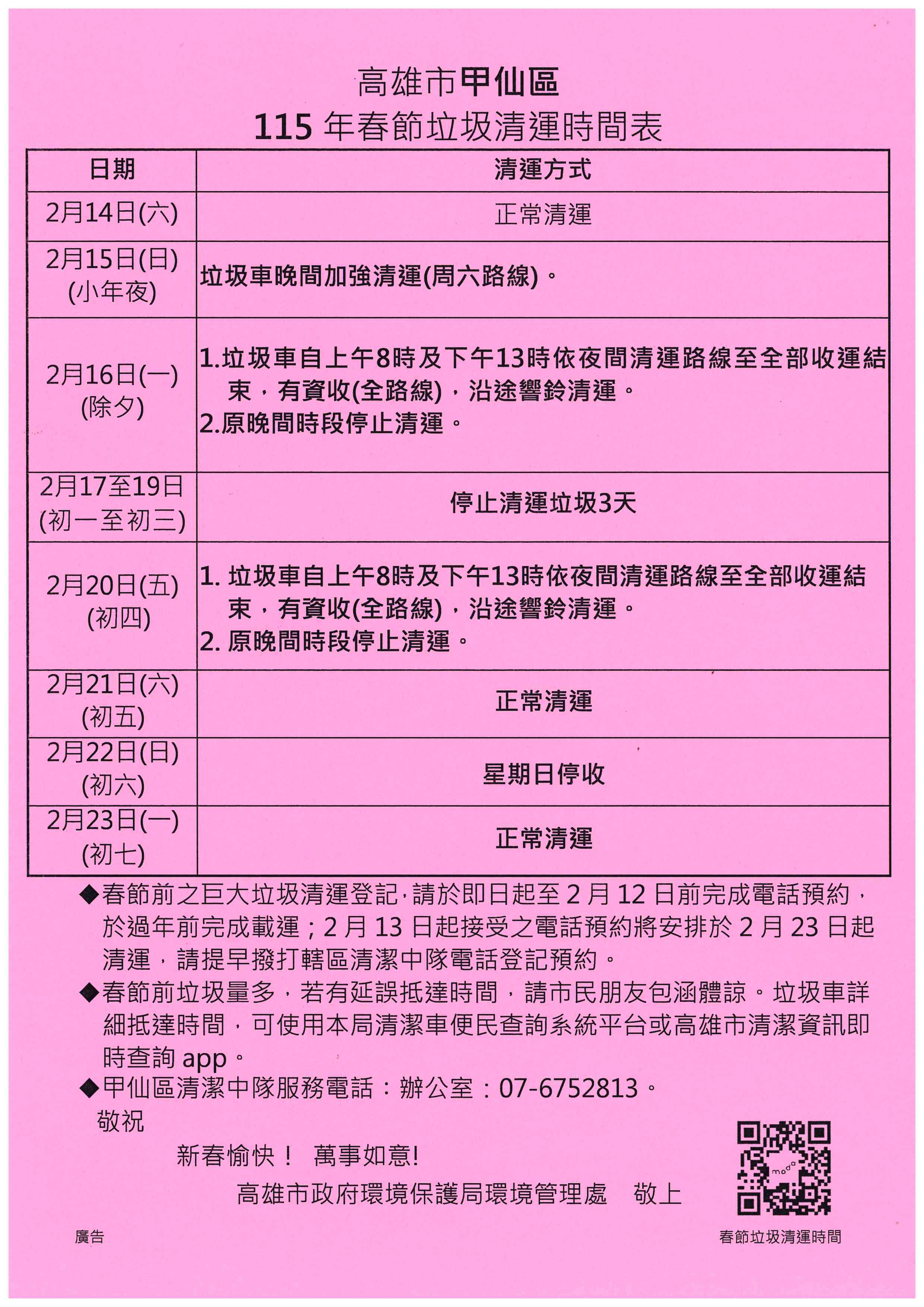 【高雄市甲仙區115年春節垃圾清運時間】
